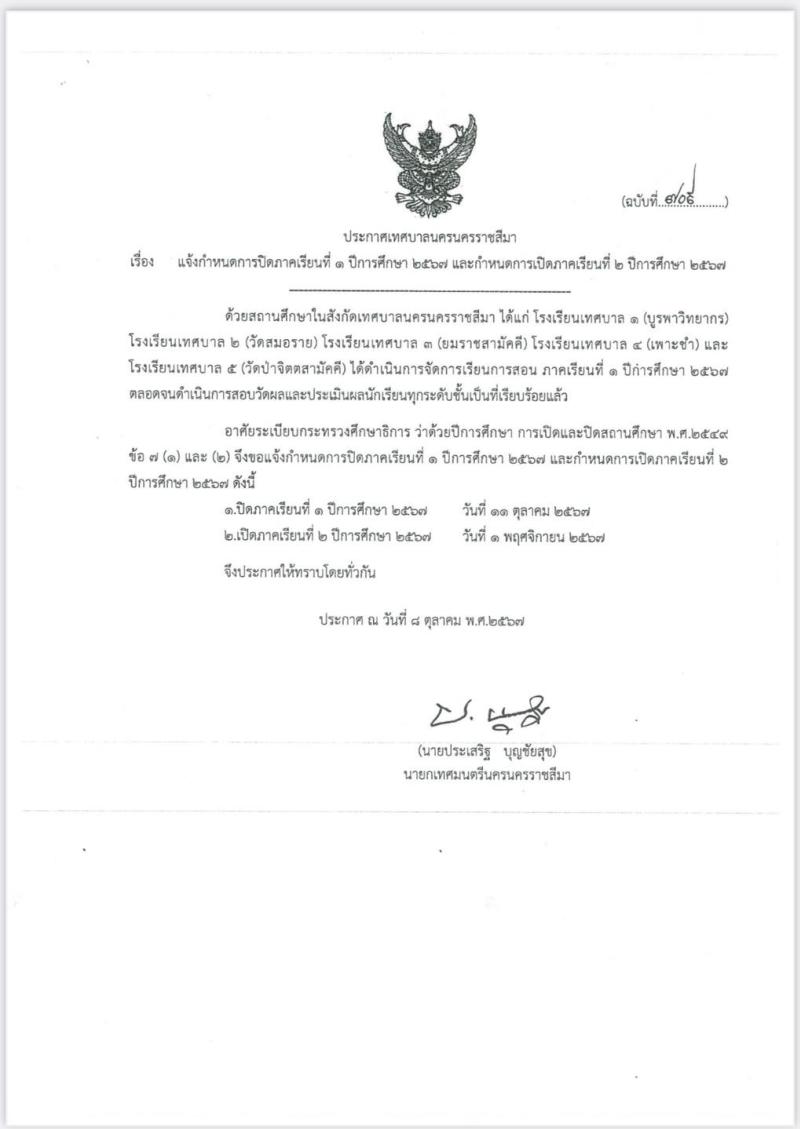 แจ้งกำหนดการปิดภาคเรียนที่ 1 และการเปิดภาคเรียนที่ 2 ประจำปีการศึกษา 2567 โรงเรียนในสังกัดเทศบาลนครน..