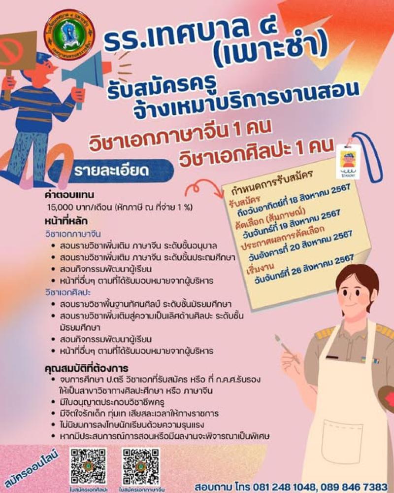 รับสมัครครูจ้างเหมาบริการงานสอน วิชาเอกศิลปะ 1 คน / วิชาเอกภาษาจีน 1 คน เงินเดือน 15,000 บาท (หักภ..