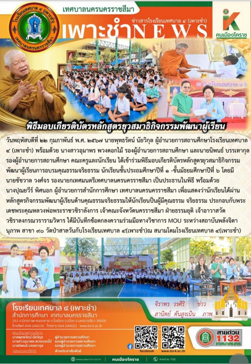 วันพฤหัสบดีที่ ๒๒ กุมภาพันธ์ พ.ศ. ๒๕๖๗ พิธีมอบเกียรติบัตรหลักสูตรยุวสมาธิ กิจกรรมพัฒนาผู้เรียนการอบร..