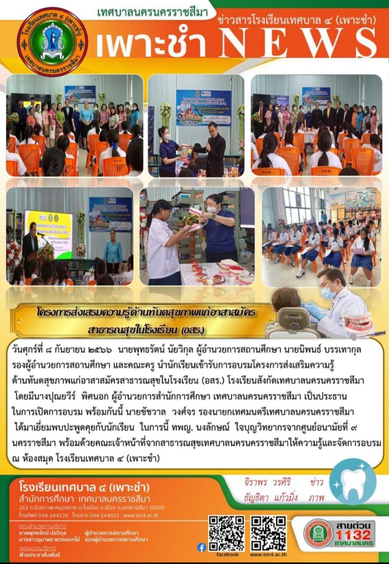วันศุกร์ที่ 8 กันยายน 2566 นักเรียนเข้ารับการอบรมโครงการส่งเสริมความรู้ด้านทันตสุขภาพแก่อาสาสมัครสาธ..