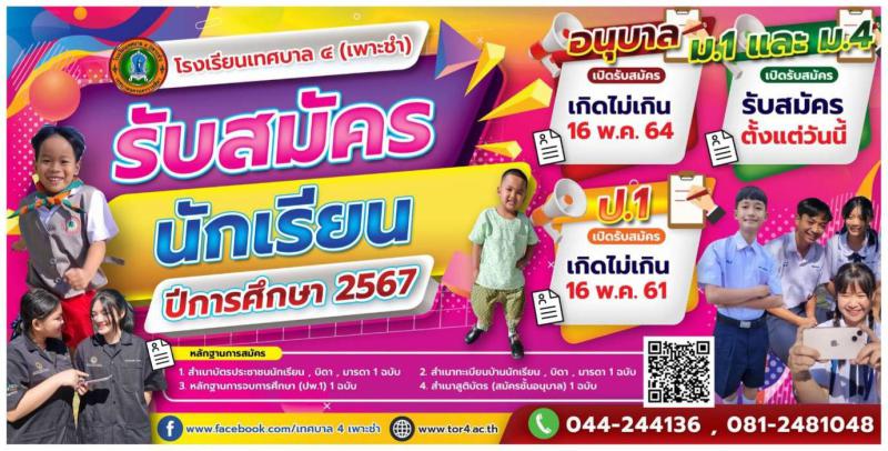 โรงเรียนเทศบาล ๔ (เพาะชำ)รับสมัครนักเรียน ประจำปีการศึกษา 2567 ระดับชั้น อนุบาล ป.1 ม.1 เเละ ม.4